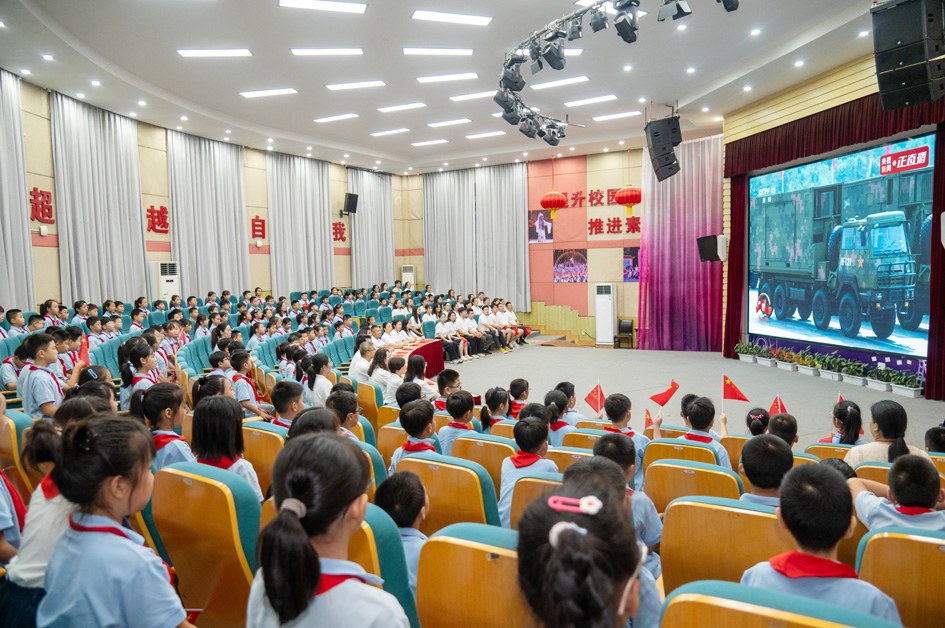 在亭林小学的报告厅内,师生代表们齐聚一堂,共同观看阅兵仪式。当看到坦克方队驶过天安门前,学生们情不自禁地挥舞国旗,自豪的笑容绽放在他们的脸上。
